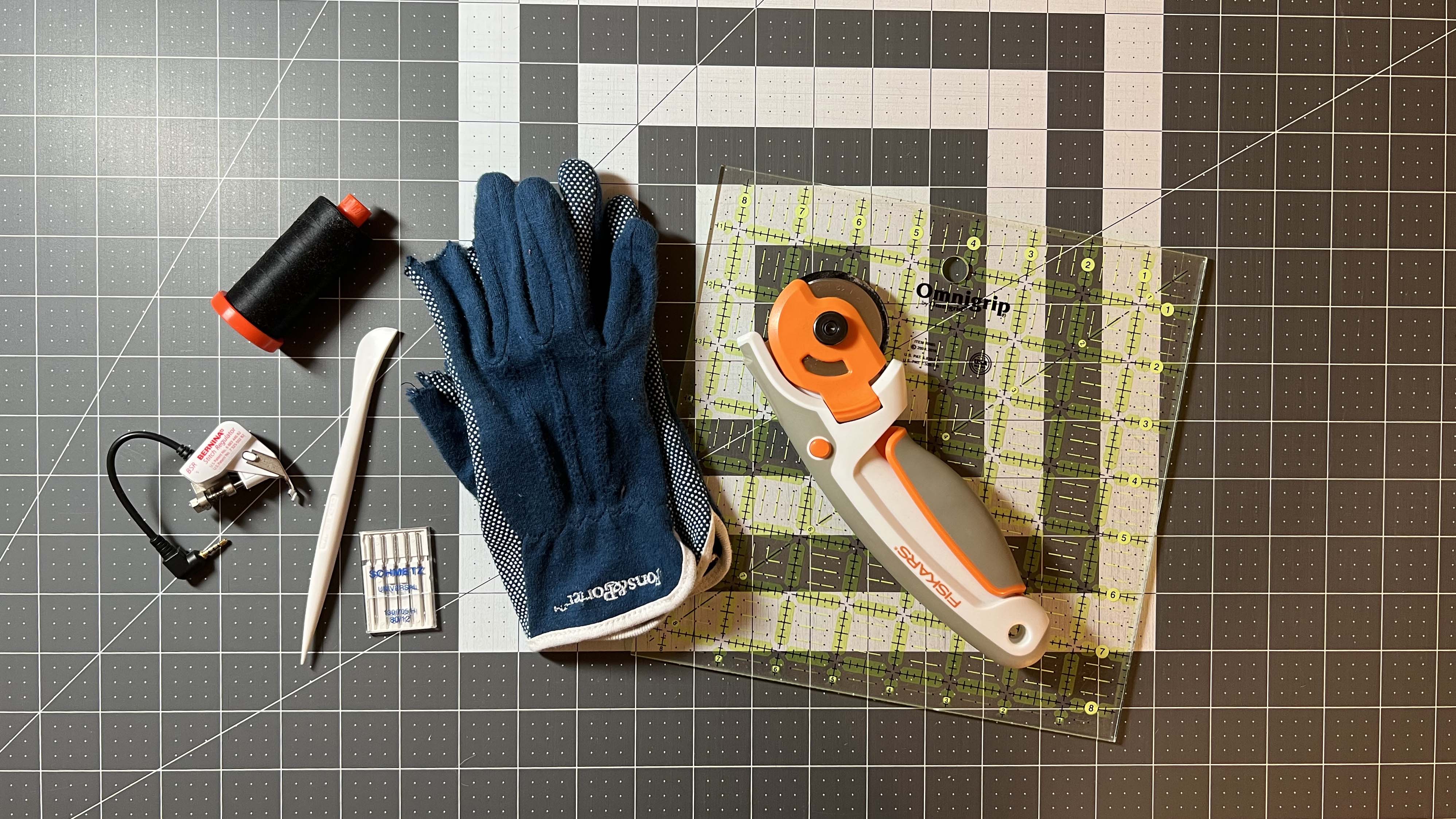 I wear grippy gloves while quilting to gain better control of the quilt sandwich and to prevent cramping and fatigue in my hands. The first thing I do when starting a new pair is cut the tips off my thumbs and index fingers, allowing me to snip threads, change bobbins, or thread my machine without removing them.