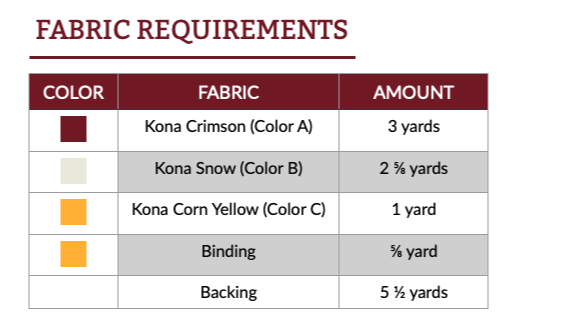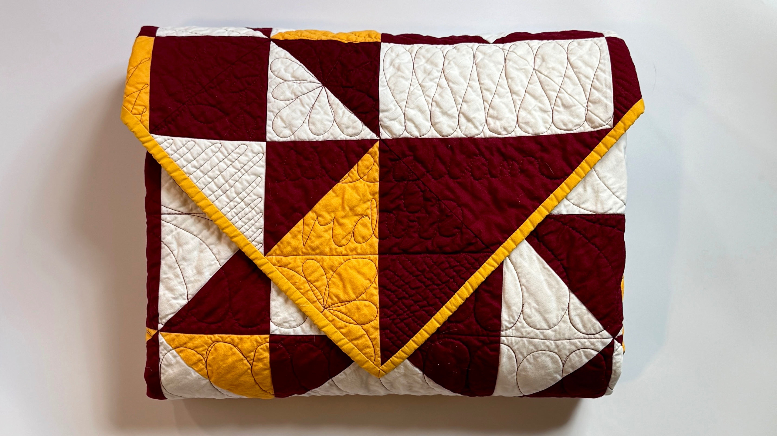 The cover quilt is shown in maroon, white, and yellow, a combination inspired by my niece’s high school and college colors—but the design works beautifully in any three-color combination, making it perfect for school colors.